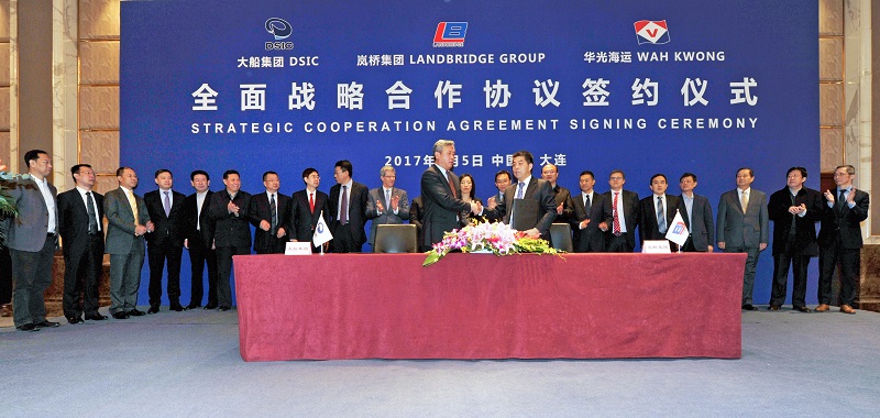 On Jan.5, 2017, the No.67 308k DWT VLCC” Rui Hong” built for Landbridge Group by DSIC was named and delivered. Meanwhile, DSIC signed an overall strategic cooperation agreement with Landbridge Group and Wah Kwong Maritime Transport Holdings officially, where the three parties shall establish the strategic tie-up in the fields of newbuilding, project investment, project finance, investment attraction and capital operation. Up to now, DSIC has achieved a good start in production of 2017. Landbridge Group Chairman and CEO Ye Cheng and DSIC leaders Liu Zheng, Yu Fengping, Cai Zhuyi and Deng Changlian attended the ceremony.