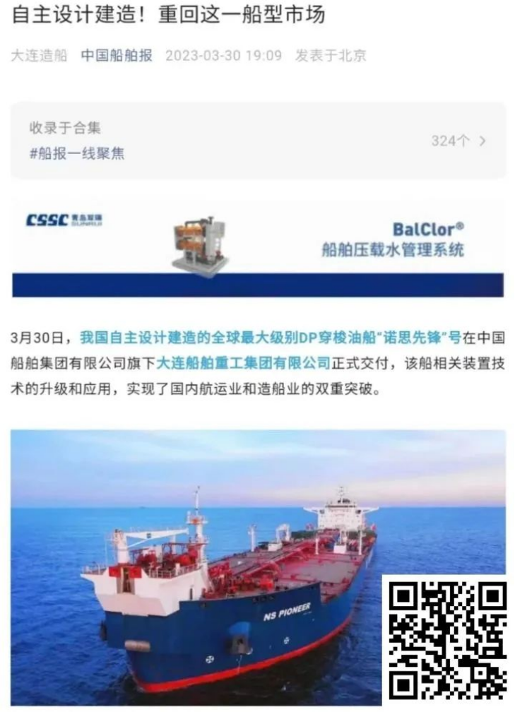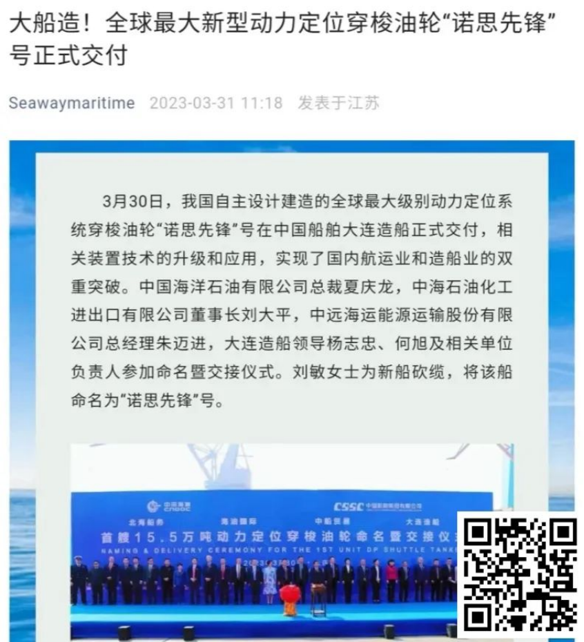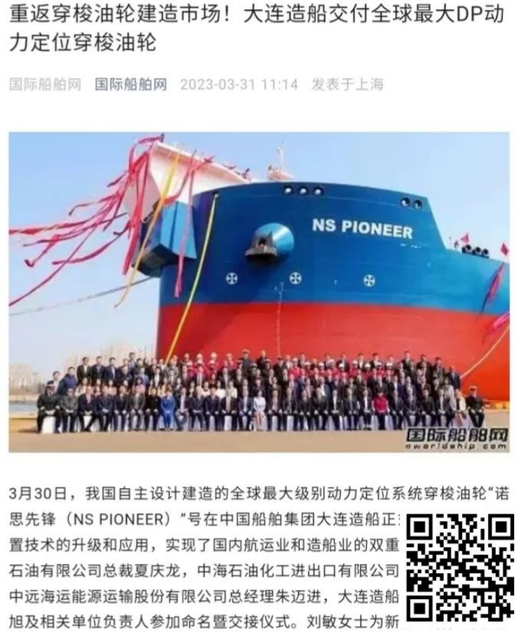 On March 30,The 155,000 ton shuttle tanker "NS PIONEER" built by DSIC of China State Shipbuilding Corporation Limited(CSSC) for Shanghai Beihai Shipping, was officially delivered.
